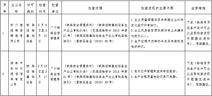 按照《行政許可法》《鐵路安全管理條例》等法律法規,以及《鐵路運輸基礎設備生產企業審批辦法》《鐵路運輸基礎設備生產企業審批實施細則》有關規定,依據《鐵路專用設備行政許可企業監督檢查計劃管理辦法》(國鐵設備監〔2014〕27號)、《國家鐵路局關于印發<2023年度鐵路專用設備行政許可企業監督檢查計劃>的通知》(國鐵設備監函〔2023〕1號),依法對柳州桂通精密鑄造有限公司、湖南中車時代通信信號有限公司開展監督檢查,共發現問題13項,下發《鐵路專用設備行政許可企業監督檢查發現問題整改通知書》2份。同時要求相關企業對監督檢查發現的問題進行整改,并將整改措施和整改情況及時報廣州鐵路監督管理局。廣州鐵路監督管理局將結合履職工作實際,適時對企業整改情況進行復查。現將監督檢查結果通報如下: