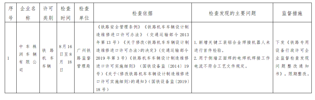 按照《行政許可法》《鐵路安全管理條例》等法律法規,以及《鐵路機車車輛設計制造維修進口許可辦法》《鐵路機車車輛設計制造維修進口許可實施細則》有關規定,依據《鐵路專用設備行政許可企業監督檢查計劃管理辦法》(國鐵設備監〔2014〕27號)、《國家鐵路局關于印發<2023年度鐵路專用設備行政許可企業監督檢查計劃>的通知》(國鐵設備監函〔2023〕1號),依法對中車株洲車輛有限公司開展監督檢查,共發現問題6項,下發《鐵路專用設備行政許可企業監督檢查發現問題整改通知書》1份。要求企業對監督檢查發現的問題進行整改,并將整改措施和整改情況及時報廣州鐵路監督管理局。廣州鐵路監督管理局將結合履職工作實際,適時對企業整改情況進行復查。現將監督檢查結果通報如下: