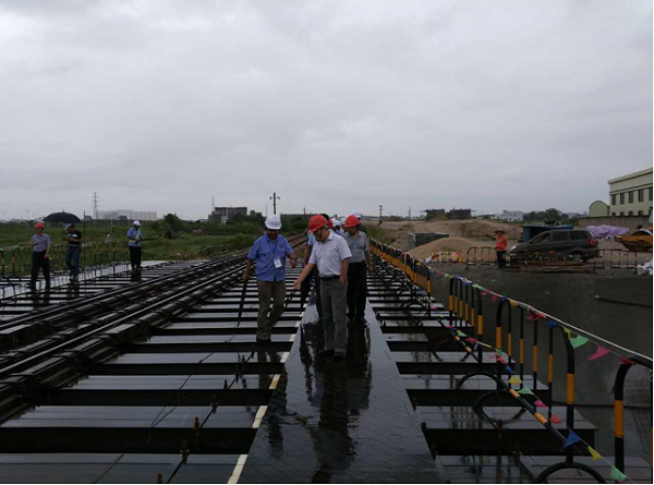 圖為檢查組現(xiàn)場檢查京九線跨線橋施工情況。