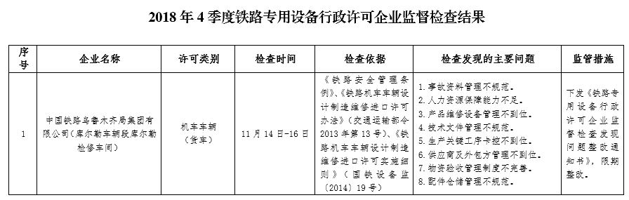 2018年4季度,蘭州鐵路監督管理局認真貫徹落實國務院“放管服”改革要求,持續加強鐵路專用設備產品質量安全監管工作。按照鐵路專用設備行政許可相關法律法規和文件規定,依據《2018年度鐵路專用設備行政許可企業監督檢查計劃》(國鐵設備監〔2017〕181號)安排,按照“雙隨機、一公開”相關規定,依法監督檢查鐵路專用設備行政許可企業1家,發現問題8項,下發《鐵路專用設備行政許可企業監督檢查發現問題整改通知書》1份。同時要求企業對監督檢查發現的問題進行整改,并將整改措施和整改情況及時報蘭州鐵路監督管理局。蘭州鐵路監督管理局將結合履職工作實際,適時對企業整改情況進行復查。現將監督檢查結果通報如下: