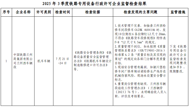 2025年3季度,蘭州鐵路監督管理局按照鐵路專用設備行政許可相關法律法規和文件規定,依據《國家鐵路局關于印發<2025年度鐵路專用設備行政許可企業監督檢查計劃>的通知》(國鐵設備監函〔2025〕8號),檢查鐵路專用設備行政許可企業1家,下發《鐵路專用設備行政許可企業監督檢查發現問題整改通知書》1份。要求受檢企業對監督檢查發現的問題進行整改,將整改措施和整改情況及時報蘭州鐵路監督管理局。現將監督檢查結果通報如下: