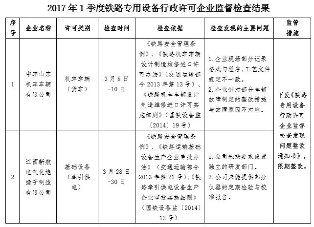 2017年1季度,上海鐵路監督管理局認真貫徹落實國務院“簡政放權、放管結合、優化服務”和“雙隨機、一公開”監管改革精神,持續加強鐵路專用設備產品質量安全監管工作。按照《行政許可法》、《鐵路安全管理條例》等法律法規和鐵路專用設備相關行政許可辦法及實施細則有關規定,依據《鐵路專用設備行政許可企業監督檢查計劃管理辦法》(國鐵設備監〔2014〕27號)、《2017年度鐵路專用設備行政許可企業監督檢查計劃》(國鐵設備監〔2016〕188號),按照“雙隨機、一公開”規定,依法對中車山東機車車輛有限公司和江西新航電氣化絕緣子制造有限公司開展監督檢查,發現問題12項,下發《鐵路專用設備行政許可企業監督檢查發現問題整改通知書》2份。同時要求相關企業對監督檢查發現的問題進行整改,并將整改措施和整改情況及時報上海鐵路監督管理局。上海鐵路監督管理局將結合履職工作實際,適時對企業整改情況進行復查。現將監督檢查結果通報如下: