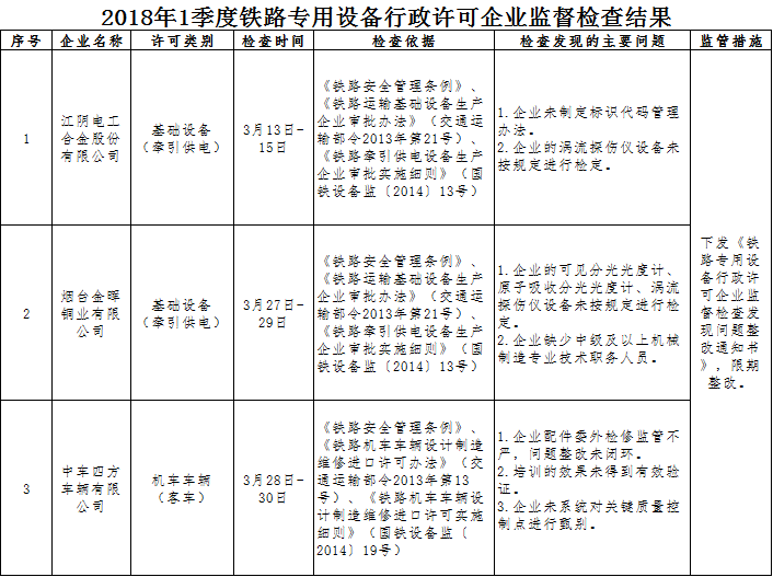 2018年1季度,上海鐵路監督管理局認真貫徹落實國務院“簡政放權、放管結合、優化服務”和“雙隨機、一公開”監管改革精神,持續加強鐵路專用設備產品質量安全監管工作。按照《行政許可法》、《鐵路安全管理條例》等法律法規和鐵路專用設備相關行政許可辦法及實施細則有關規定,依據《鐵路專用設備行政許可企業監督檢查計劃管理辦法》(國鐵設備監〔2014〕27號)、《2018年度鐵路專用設備行政許可企業監督檢查計劃》(國鐵設備監〔2017〕181號),依法對江陰電工合金股份有限公司、煙臺金暉銅業有限公司、中車四方車輛有限公司開展監督檢查,發現問題47項,下發《鐵路專用設備行政許可企業監督檢查發現問題整改通知書》3份。同時要求相關企業對監督檢查發現的問題進行整改,并將整改措施和整改情況及時報上海鐵路監督管理局。上海鐵路監督管理局將結合履職工作實際,適時對企業整改情況進行復查。現將監督檢查結果通報如下: