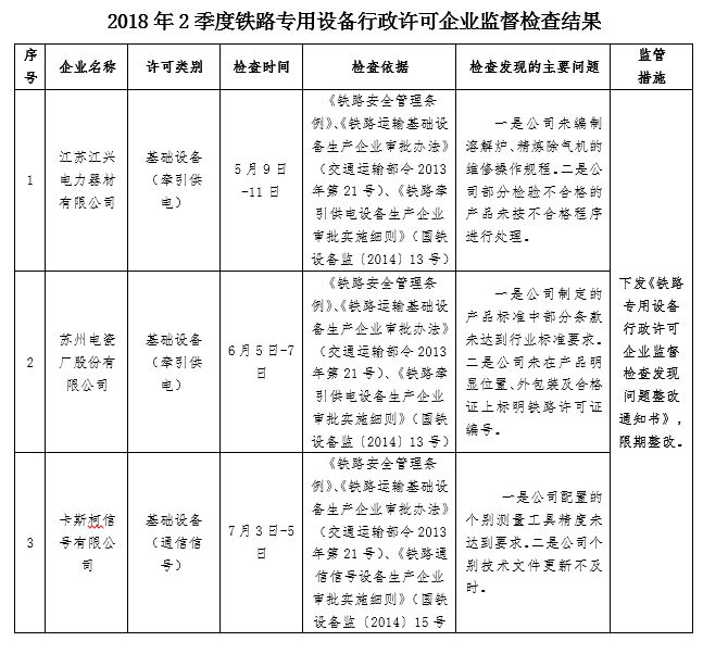 2018年2季度,上海鐵路監督管理局認真貫徹落實國務院“簡政放權、放管結合、優化服務”和“雙隨機、一公開”監管改革精神,持續加強鐵路專用設備產品質量安全監管工作。按照《行政許可法》、《鐵路安全管理條例》等法律法規和鐵路專用設備相關行政許可辦法及實施細則有關規定,依據《鐵路專用設備行政許可企業監督檢查計劃管理辦法》(國鐵設備監〔2014〕27號)、《國家鐵路局關于印發2018年度鐵路專用設備行政許可企業監督檢查計劃的通知》(國鐵設備監函〔2017〕181號),按照“雙隨機、一公開”規定,依法對江蘇江興電力器材有限公司、蘇州電瓷廠股份有限公司和卡斯柯信號有限公司開展監督檢查,發現問題48項,下發《鐵路專用設備行政許可企業監督檢查發現問題整改通知書》3份。同時要求相關企業對監督檢查發現的問題進行整改,并將整改措施和整改情況及時報上海鐵路監督管理局。上海鐵路監督管理局將結合履職工作實際,適時對企業整改情況進行復查?,F將監督檢查結果通報如下: