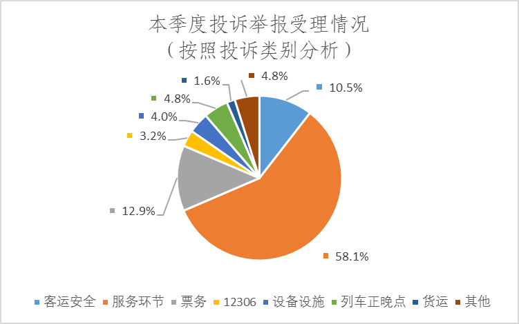 按照投訴類(lèi)別分析,投訴客運(yùn)安全13件、占比10.5%,投訴服務(wù)環(huán)節(jié)72件、占比58.1%,投訴票務(wù)16件、占比12.9%,投訴12306的4件、占比3.2%,投訴設(shè)備設(shè)施5件、占比4%,投訴列車(chē)正晚點(diǎn)6件、占比4.8%,投訴貨運(yùn)2、占比1.6%,投訴其他6件、占比4.8%。詳見(jiàn)圖1。