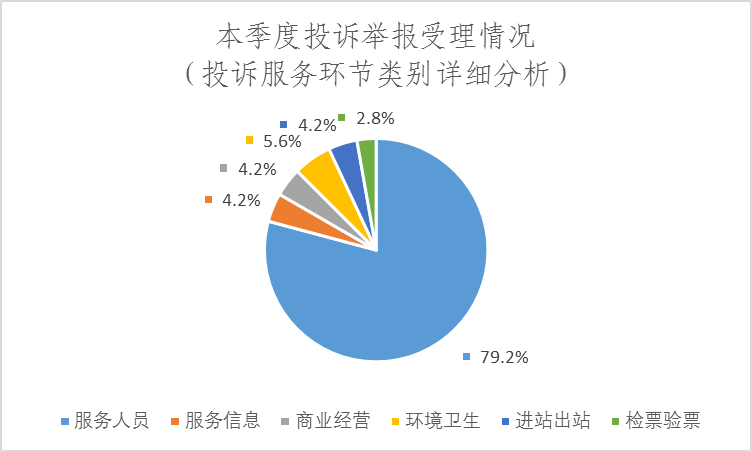 投訴服務(wù)環(huán)節(jié)的72件投訴中,投訴服務(wù)人員為57件、占比79.2%,投訴服務(wù)信息3件、占比4.2%,投訴商業(yè)經(jīng)營(yíng)3件、占比4.2%,投訴環(huán)境衛(wèi)生4件、占比5.6%,投訴進(jìn)站出站3件、占比4.2%,投訴檢票