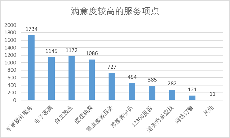 旅客滿意度較高的項(xiàng)目有車(chē)票候補(bǔ)服務(wù)、自主選座和電子客票等方面。詳見(jiàn)圖5。