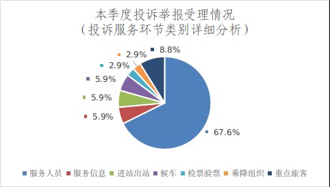 本季度受理的投訴類別主要集中在服務環節的服務人員方面,同上季度一致。受理的投訴信件主要反映出如下問題:一是部分站車工作人員存在言語不規范、服務意識不強、培訓不到位、未嚴格按標作業的情況。二是部分旅客對于鐵路運輸企業相關規定不熟悉,進站檢票、乘車,及安全檢查過程中遇到問題,尋求工作人員幫助時未能得到滿意的回復。