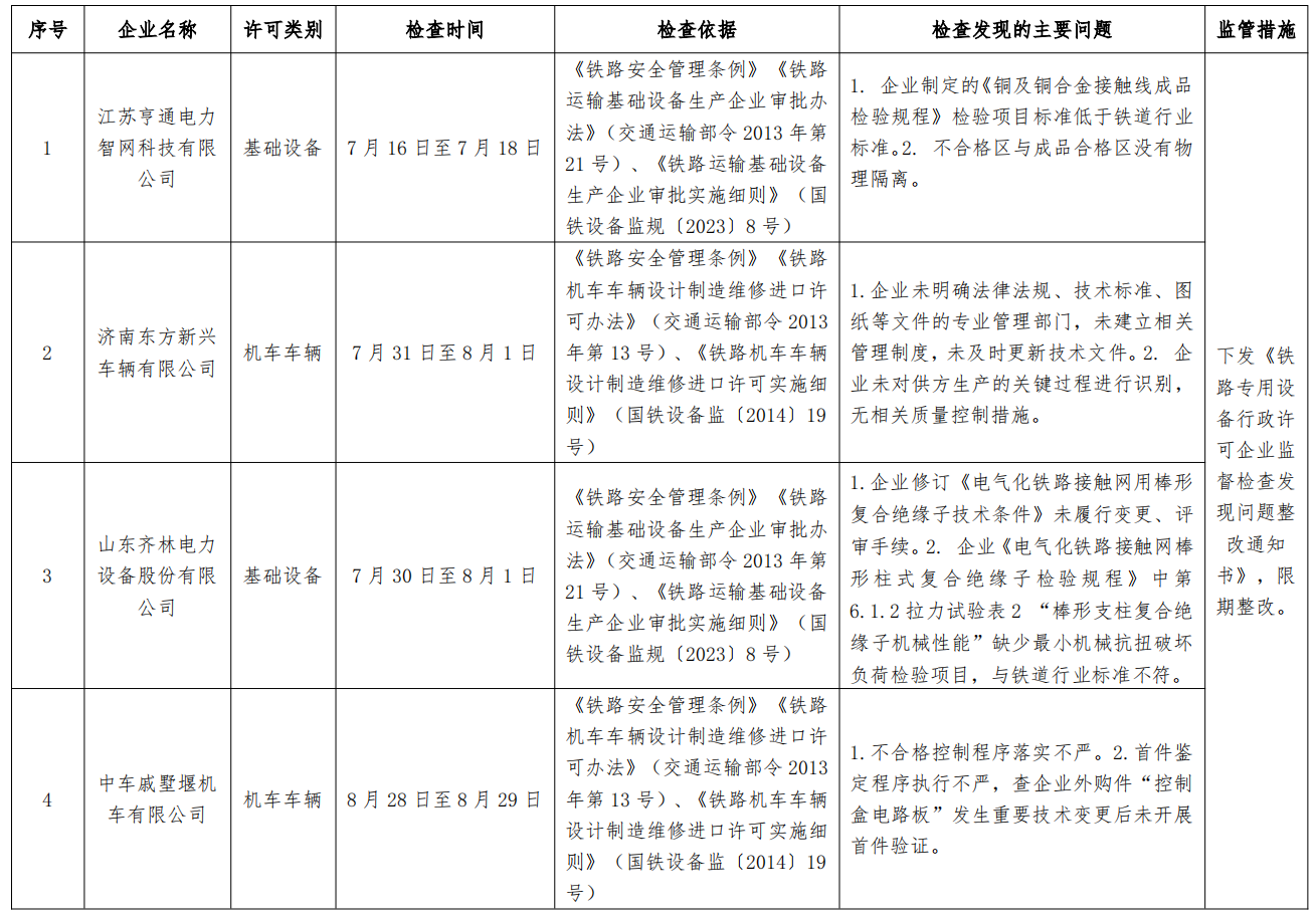 2024年3季度,上海鐵路監督管理局依據國家鐵路局關于印發《2024年度鐵路專用設備行政許可企業監督檢查計劃的通知》(國鐵設備監函〔2024〕3號),依法對濟南東方新興車輛有限公司、中車戚墅堰機車有限公司、江蘇亨通電力智網科技有限公司、山東齊林電力設備股份有限公司4家企業開展監督檢查,發現問題31項,下發《鐵路專用設備行政許可企業監督檢查發現問題整改通知書》4份。要求受檢企業對監督檢查發現的問題進行整改,將整改情況及時報送上海鐵路監督管理局。現將監督檢查結果通報如下: