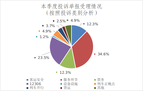 本季度受理的投訴類別主要集中在服務(wù)環(huán)節(jié)的服務(wù)人員方面,同上季度一致。受理的投訴信件主要反映出如下問題:一是部分站車工作人員存在言語不規(guī)范、服務(wù)意識不強(qiáng)的情況。二是部分旅客不清楚不了解乘車禁限帶物品、列車開停檢及改簽退票等相關(guān)規(guī)定,在進(jìn)站乘車過程中對于工作人員的要求或者操作產(chǎn)生不滿情緒。