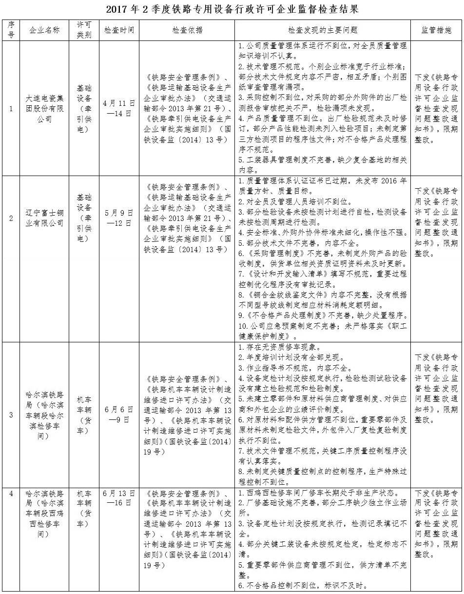 2017年2季度,沈陽鐵路監督管理局認真貫徹落實國務院“簡政放權、放管結合、優化服務”和“雙隨機、一公開”監管改革精神,持續加強鐵路專用設備產品質量安全監管工作。按照《行政許可法》、《鐵路安全管理條例》等法律法規和鐵路專用設備相關行政許可辦法及實施細則有關規定,依據《鐵路專用設備行政許可企業監督檢查計劃管理辦法》(國鐵設備監〔2014〕27號)、《2017年度鐵路專用設備行政許可企業監督檢查計劃》(國鐵設備監〔2016〕188號),按照“雙隨機、一公開”規定,依法對大連電瓷集團股份有限公司、遼寧富士銅業有限公司、哈爾濱鐵路局哈爾濱車輛段哈爾濱檢修車間和哈爾濱鐵路局哈爾濱車輛段西雞西檢修車間開展監督檢查,發現問題29項,下發《鐵路專用設備行政許可企業監督檢查發現問題整改通知書》4份。同時要求相關企業對監督檢查發現的問題進行整改,并將整改措施和整改情況及時報沈陽鐵路監督管理局。沈陽鐵路監督管理局將結合履職工作實際,適時對企業整改情況進行復查。現將監督檢查結果通報如下: