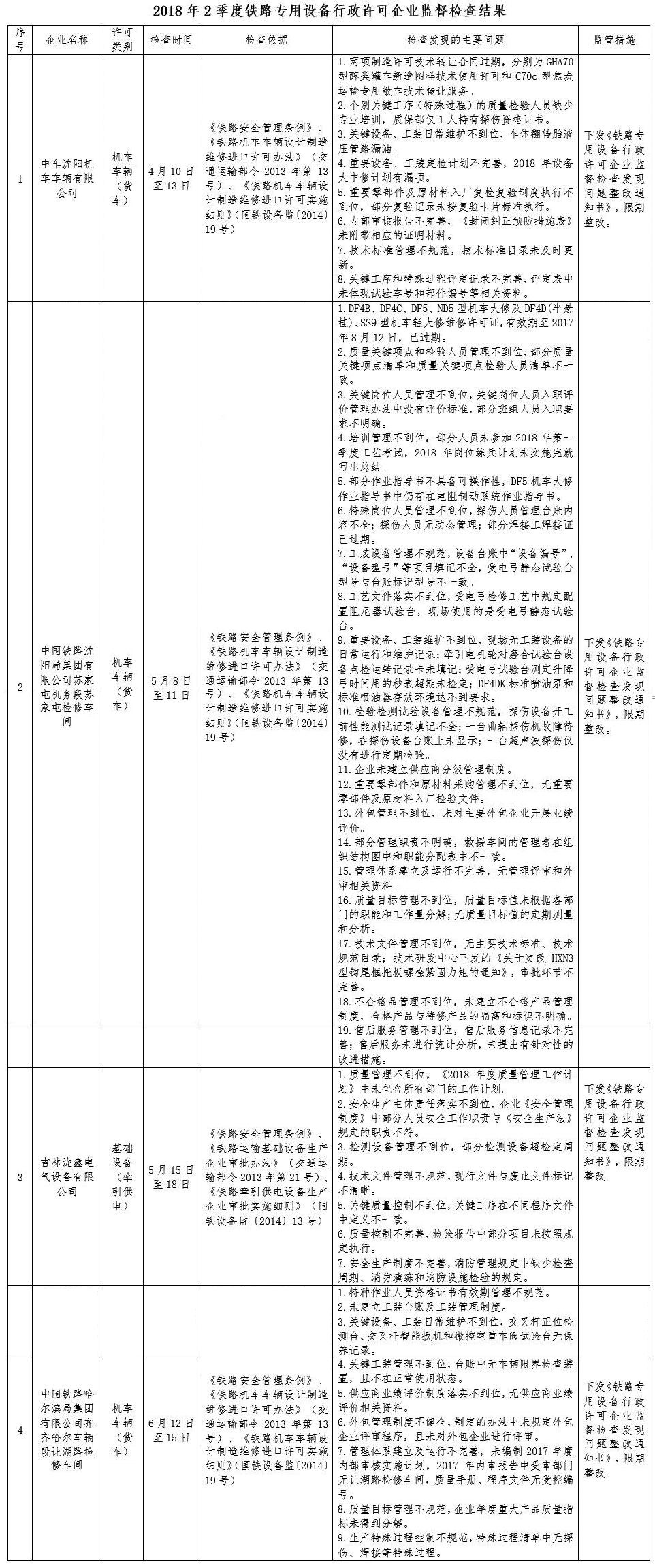 2018年2季度,沈陽(yáng)鐵路監(jiān)督管理局認(rèn)真貫徹落實(shí)國(guó)務(wù)院“簡(jiǎn)政放權(quán)、放管結(jié)合、優(yōu)化服務(wù)”和“雙隨機(jī)、一公開(kāi)”監(jiān)管改革精神,持續(xù)加強(qiáng)鐵路專(zhuān)用設(shè)備產(chǎn)品質(zhì)量安全監(jiān)管工作。按照《行政許可法》《鐵路安全管理?xiàng)l例》等法律法規(guī)和鐵路專(zhuān)用設(shè)備相關(guān)行政許可辦法及實(shí)施細(xì)則有關(guān)規(guī)定,依據(jù)《鐵路專(zhuān)用設(shè)備行政許可企業(yè)監(jiān)督檢查計(jì)劃管理辦法》(國(guó)鐵設(shè)備監(jiān)〔2014〕27號(hào))、《2018年度鐵路專(zhuān)用設(shè)備行政許可企業(yè)監(jiān)督檢查計(jì)劃》(國(guó)鐵設(shè)備監(jiān)〔2017〕181號(hào)),按照“雙隨機(jī)、一公開(kāi)”規(guī)定,依法對(duì)中車(chē)沈陽(yáng)機(jī)車(chē)車(chē)輛有限公司、中國(guó)鐵路沈陽(yáng)局集團(tuán)有限公司蘇家屯機(jī)務(wù)段蘇家屯檢修車(chē)間、吉林瀧鑫電氣設(shè)備有限公司和中國(guó)鐵路哈爾濱局集團(tuán)有限公司齊齊哈爾車(chē)輛段讓湖路檢修車(chē)間開(kāi)展監(jiān)督檢查,發(fā)現(xiàn)問(wèn)題43項(xiàng),下發(fā)《鐵路專(zhuān)用設(shè)備行政許可企業(yè)監(jiān)督檢查發(fā)現(xiàn)問(wèn)題整改通知書(shū)》4份。同時(shí)要求相關(guān)企業(yè)對(duì)監(jiān)督檢查發(fā)現(xiàn)的問(wèn)題進(jìn)行整改,并將整改措施和整改情況及時(shí)報(bào)沈陽(yáng)鐵路監(jiān)督管理局。沈陽(yáng)鐵路監(jiān)督管理局將結(jié)合履職工作實(shí)際,適時(shí)對(duì)企業(yè)整改情況進(jìn)行復(fù)查。現(xiàn)將監(jiān)督檢查結(jié)果通報(bào)如下: