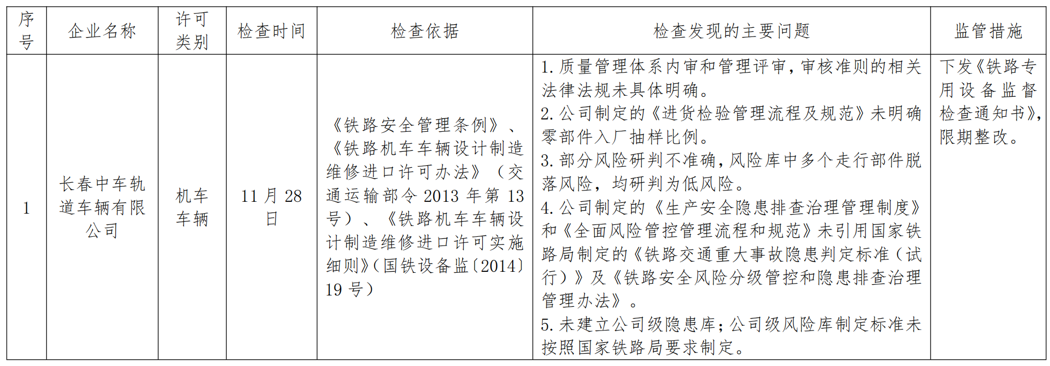 2024年4季度,沈陽鐵路監督管理局認真貫徹落實國務院“簡政放權、放管結合、優化服務”和“雙隨機、一公開”監管規定,持續加強鐵路專用設備產品質量安全監管工作。按照《行政許可法》、《鐵路安全管理條例》等法律法規和鐵路專用設備相關行政許可辦法及實施細則有關規定,依據《鐵路專用設備行政許可企業監督檢查計劃管理辦法》(國鐵設備監〔2014〕27號)、《國家鐵路局關于印發2024年度鐵路專用設備行政許可企業監督檢查計劃的通知》(國鐵設備監〔2024〕3號),按照“雙隨機、一公開”規定,依法對長春中車軌道車輛有限公司開展監督檢查,發現問題5項,下發《鐵路專用設備監督檢查通知書》1份。同時要求企業對監督檢查發現的問題進行整改,并將整改措施和整改情況及時報沈陽鐵路監督管理局。沈陽鐵路監督管理局將結合履職工作實際,適時對企業整改情況進行復查。現將監督檢查結果通報如下: