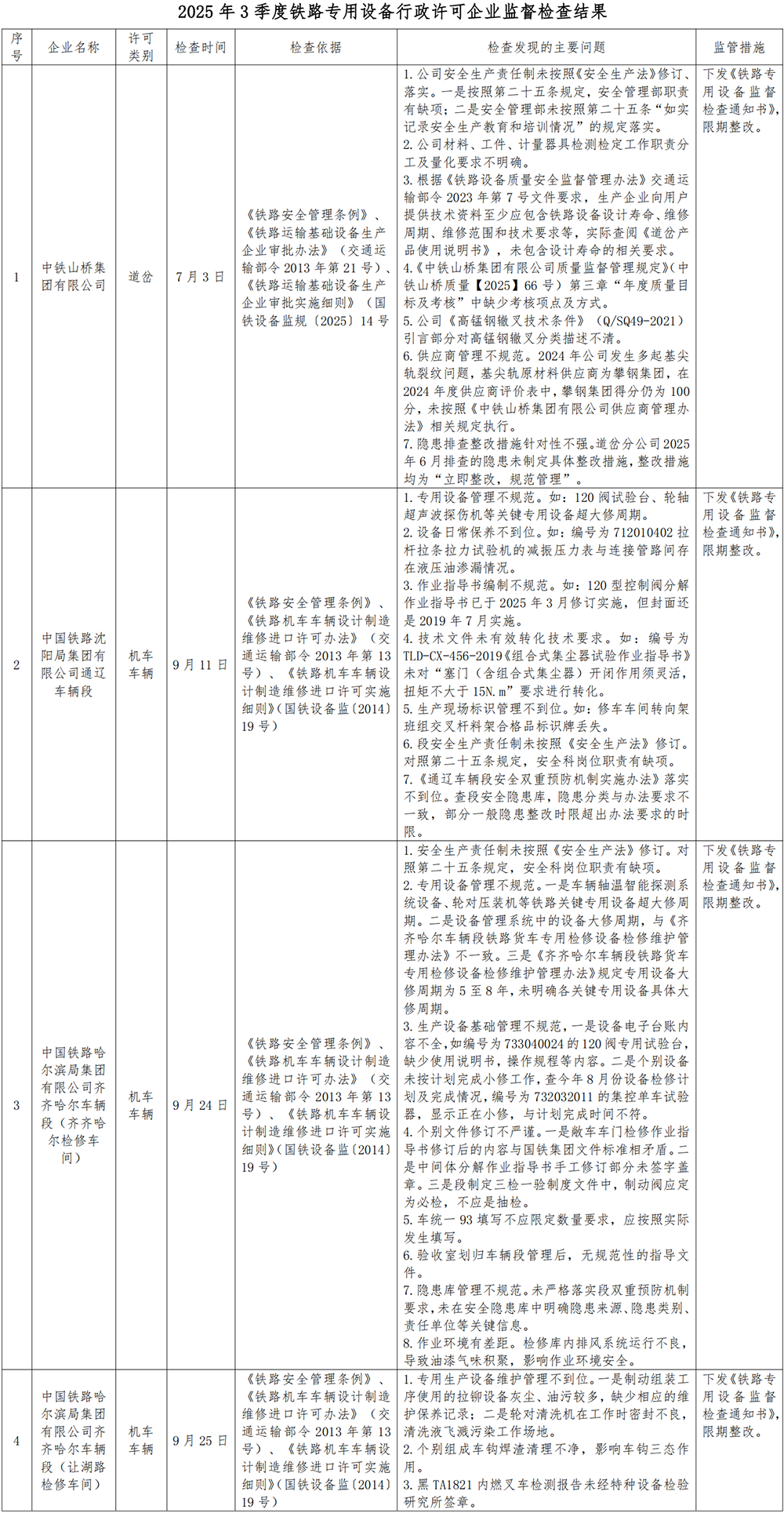 2025年3季度,沈陽(yáng)鐵路監(jiān)督管理局根據(jù)國(guó)家鐵路局關(guān)于印發(fā)《2025年度鐵路專用設(shè)備行政許可企業(yè)監(jiān)督檢查計(jì)劃》的通知(國(guó)鐵設(shè)備監(jiān)函〔2025〕8號(hào)),依法對(duì)中鐵山橋集團(tuán)有限公司、中國(guó)鐵路沈陽(yáng)局集團(tuán)有限公司通遼車輛段和中國(guó)鐵路哈爾濱局集團(tuán)有限公司齊齊哈爾車輛段(齊齊哈爾檢修車間和讓湖路檢修車間)開展監(jiān)督檢查,共發(fā)現(xiàn)問(wèn)題25項(xiàng),下發(fā)《鐵路專用設(shè)備監(jiān)督檢查通知書》4份,要求受檢企業(yè)對(duì)監(jiān)督檢查發(fā)現(xiàn)的問(wèn)題進(jìn)行整改,將整改情況及時(shí)報(bào)送沈陽(yáng)鐵路監(jiān)督管理局。現(xiàn)將監(jiān)督檢查結(jié)果通報(bào)如下:
