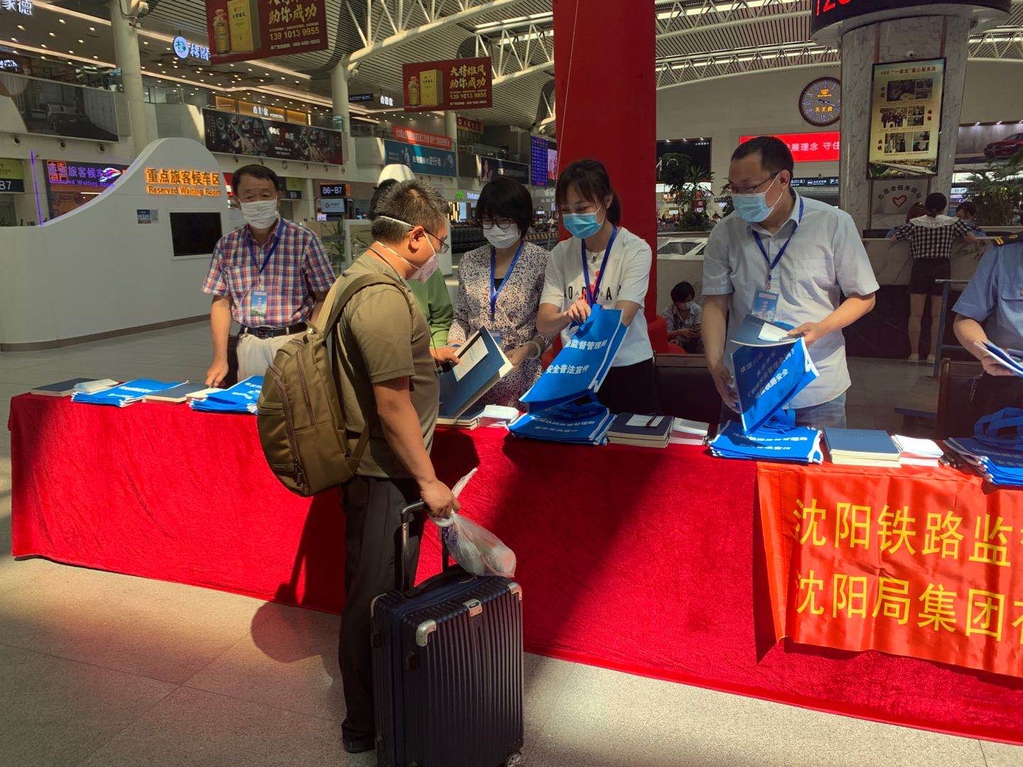 圖為監(jiān)管局工作人員在沈陽北站向旅客發(fā)放宣傳用品