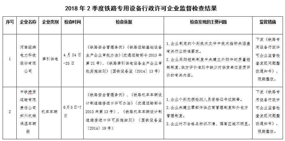 2018年2季度,武漢鐵路監督管理局認真貫徹落實國務院“放管服”改革和“雙隨機、一公開”監管改革要求,持續加強鐵路設備產品質量安全監管工作。按照《國家鐵路局關于印發<2018年度鐵路專用設備行政許可企業監督檢查計劃>的通知》(國鐵設備監函〔2017〕181號)安排,監督檢查鐵路專用設備行政許可企業2家,發現問題13項,下發《鐵路專用設備行政許可企業監督檢查發現問題整改通知書》2份。對監督檢查發現的問題,相關企業要按要求整改到位,并將整改情況及時反饋檢查單位。武漢鐵路監督管理局將結合履職工作實際,適時對企業整改情況進行復查。現將監督檢查結果通報如下: