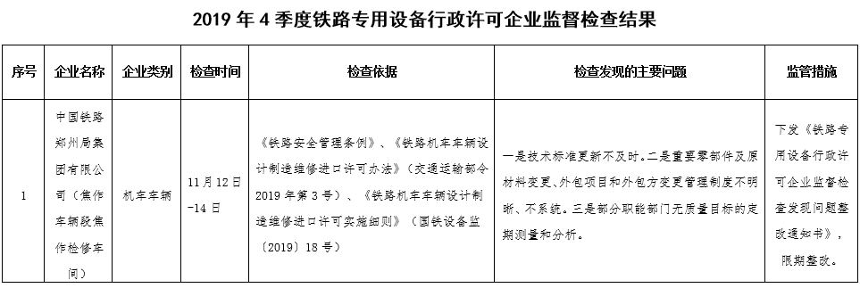 2019年4季度,武漢鐵路監(jiān)督管理局認(rèn)真貫徹落實(shí)國(guó)務(wù)院“放管服”改革和“雙隨機(jī)、一公開”監(jiān)管改革要求,持續(xù)加強(qiáng)鐵路設(shè)備產(chǎn)品質(zhì)量安全監(jiān)管工作。依據(jù)《鐵路專用設(shè)備行政許可企業(yè)監(jiān)督檢查計(jì)劃管理辦法》(國(guó)鐵設(shè)備監(jiān)〔2014〕27號(hào))、《國(guó)家鐵路局關(guān)于印發(fā)<2019年度鐵路專用設(shè)備行政許可企業(yè)監(jiān)督檢查計(jì)劃>的通知》(國(guó)鐵設(shè)備監(jiān)函〔2019〕2號(hào)),依法對(duì)中國(guó)鐵路鄭州局集團(tuán)有限公司(焦作車輛段焦作檢修車間)進(jìn)行監(jiān)督檢查,發(fā)現(xiàn)問(wèn)題5項(xiàng),下發(fā)《鐵路專用設(shè)備行政許可企業(yè)監(jiān)督檢查發(fā)現(xiàn)問(wèn)題整改通知書》1份。對(duì)監(jiān)督檢查發(fā)現(xiàn)的問(wèn)題,要求企業(yè)整改到位,并將整改措施和整改情況及時(shí)反饋武漢鐵路監(jiān)督管理局。武漢鐵路監(jiān)督管理局將結(jié)合履職工作實(shí)際,適時(shí)對(duì)企業(yè)整改情況進(jìn)行復(fù)查。現(xiàn)將監(jiān)督檢查結(jié)果通報(bào)如下: