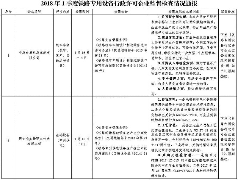 2018年1季度,西安鐵路監督管理局認真貫徹落實國務院“放管服”改革和“雙隨機、一公開”監管改革要求,持續加強鐵路設備產品質量安全監管工作。依據《2018年度鐵路專用設備行政許可企業監督檢查計劃》(國鐵設備監函〔2018〕181號)安排,共監督檢查鐵路專用設備行政許可企業2家,下發《鐵路專用設備行政許可企業監督檢查發現問題整改通知書》2份。對監督檢查發現的問題,各相關企業要按要求整改到位,并及時反饋整改情況。西安鐵路監督管理局將結合履職工作實際,適時對企業整改情況進行復查。現將監督檢查結果通報如下: