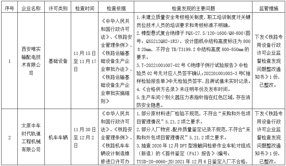 2022年第四季度,西安鐵路監督管理局為貫徹落實國務院深化“放管服”改革和優化營商環境有關要求持續推進“雙隨機、一公開”監管工作,切實規范和加強事中事后監管,督促鐵路裝備制造生產維修企業落實安全生產主體責任,提升鐵路專用產品質量,防止鐵路重特大事故發生,按照《鐵路專用設備行政許可企業監督檢查計劃管理辦法》等有關規定,依據國家鐵路局《2022年度鐵路專用設備行政許可企業監督檢查計劃》,對西安唯實輸配電技術有限公司、太原中車時代軌道工程機械有限公司2家企業可持續滿足行政許可條件開展了監督檢查,發現問題13件,下發《鐵路專用設備行政許可企業監督檢查發現問題整改通知書》2份。現將監督檢查結果通報如下: