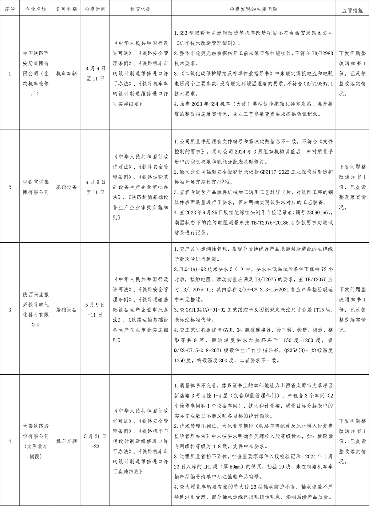 2024年2季度,西安鐵路監(jiān)督管理局依據(jù)《中華人民共和國行政許可法》《鐵路安全管理條例》《鐵路機(jī)車車輛設(shè)計制造維修進(jìn)口許可辦法》《鐵路運輸基礎(chǔ)設(shè)備生產(chǎn)企業(yè)審批辦法》等法律、法規(guī)、規(guī)章和規(guī)范性文件,按照《國家鐵路局關(guān)于印發(fā)<2024年度鐵路專用設(shè)備行政許可企業(yè)監(jiān)督檢查計劃>的通知》(國鐵設(shè)備監(jiān)函〔2024〕3號)要求,依法對中國鐵路西安局集團(tuán)有限公司(寶雞機(jī)車檢修廠)、中鐵寶橋集團(tuán)有限公司、陜西興盛振興鐵路電氣化器材有限公司及大秦鐵路股份有限公司(太原北車輛段)等4家企業(yè)開展了監(jiān)督檢查,發(fā)現(xiàn)問題30件,下發(fā)問題整改通知書4份,要求受檢企業(yè)對監(jiān)督檢查發(fā)現(xiàn)的問題進(jìn)行整改,將整改措施和整改情況及時報送西安鐵路監(jiān)督管理局。現(xiàn)將監(jiān)督檢查結(jié)果通報如下: