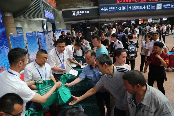 國家鐵路局工作人員向旅客發放鐵路安全生產宣傳資料