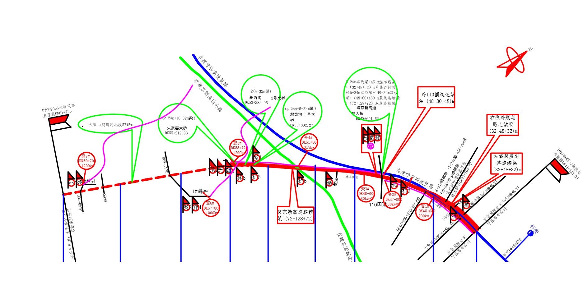 新建大同至張家口高速鐵路位于河北省西北部及山西省北部,本線起自在建呼張高速鐵路懷安站,西與既有北同蒲四線接軌,共設車站4個。設計時速250km/h,線路全長140.079km,總投資約180億。河北段全長15.799km,其中橋梁總長8.184km,隧道總長5.715km,橋隧比例為92.1%。