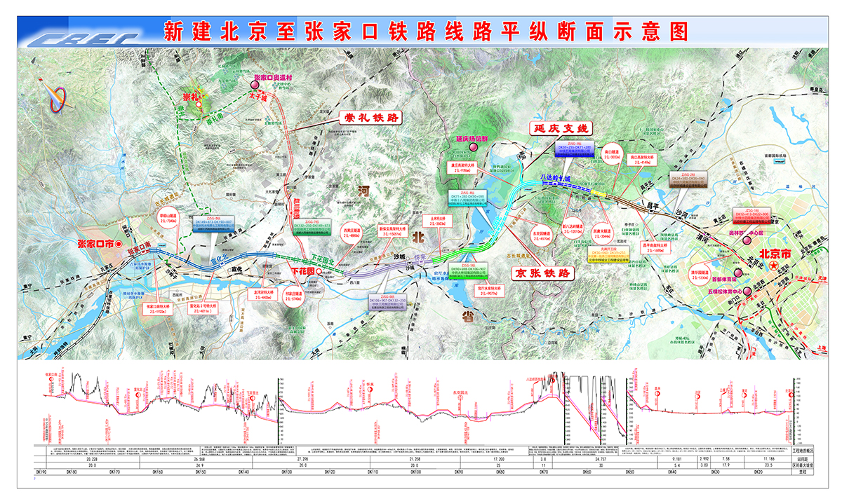 新建北京至張家口鐵路位于北京市西北、河北省北部,本線起自北京北站,西迄張家口南站,共設車站10個,動車所1處。設計時速250km/h、350km/h(昌平至下花園北段),新建正線全長173.964km(北京市境內70.503km,河北省境內103.461km),延慶支線線路總長15.675km,總投資約310億。正線橋梁總長67.2km,隧道總長48.386km,橋隧比例為66.4%。
