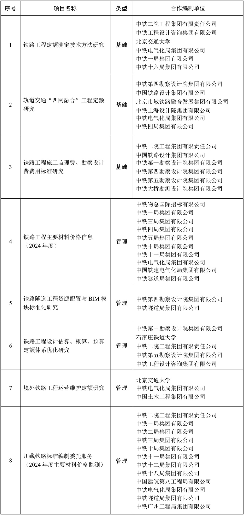 2024年鐵路工程造價標準項目合作編制單位匯總表